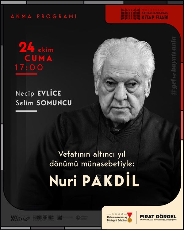Büyükşehir Belediyesinden yapılan açıklamada, Uluslararası Kahramanmaraş Kitap Fuarı kapsamında düzenlenecek bu anlamlı programa tüm vatandaşların davetli olduğu belirtilerek, “Kahramanmaraş’ın yetiştirdiği büyük bir fikir ve edebiyat insanı olan Nuri Pakdil’i, vefatının altıncı yıl dönümünde rahmet ve minnetle anıyoruz. Onun eserlerinden, fikirlerinden ve duruşundan ilham almak üzere tüm hemşehrilerimizi bu özel programa bekliyoruz” ifadelerine yer verildi.