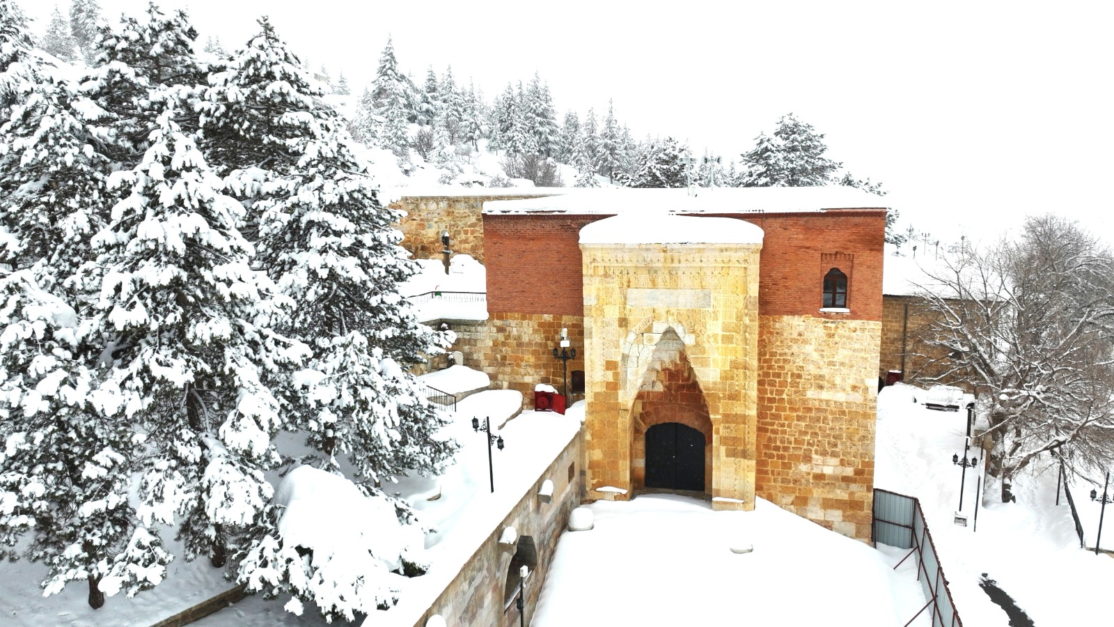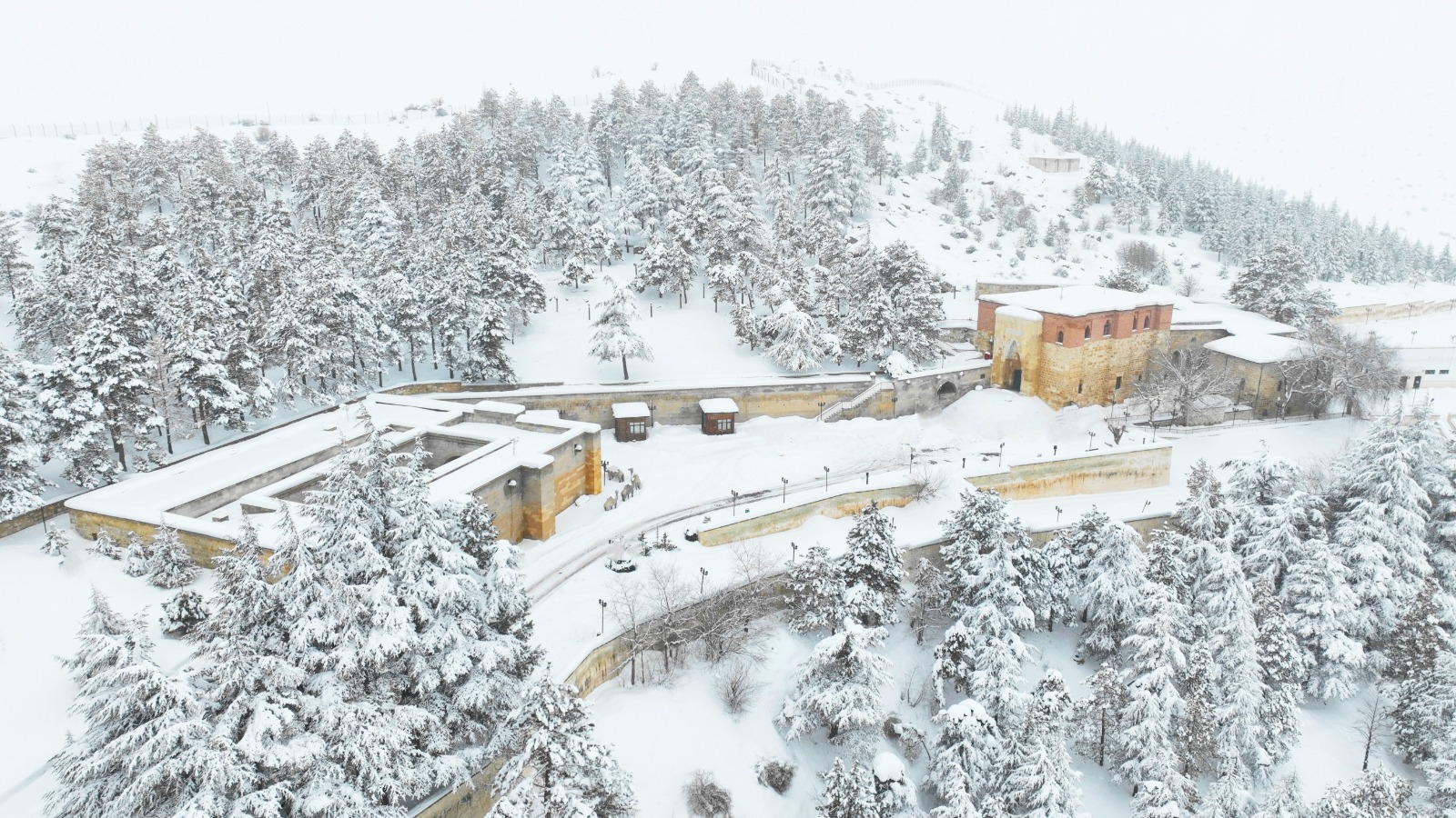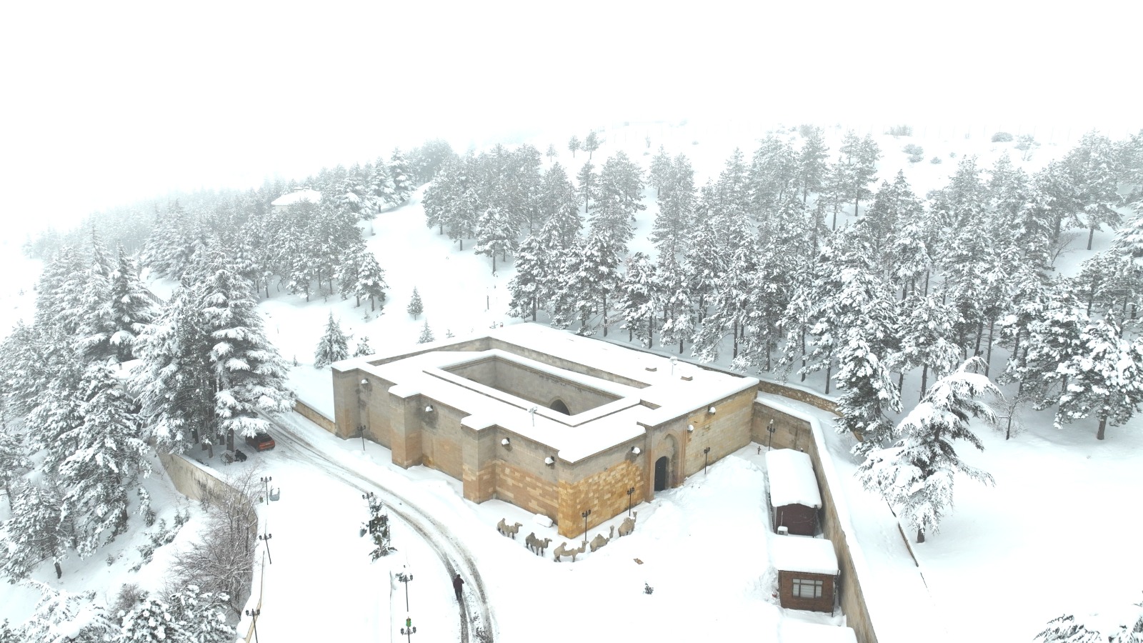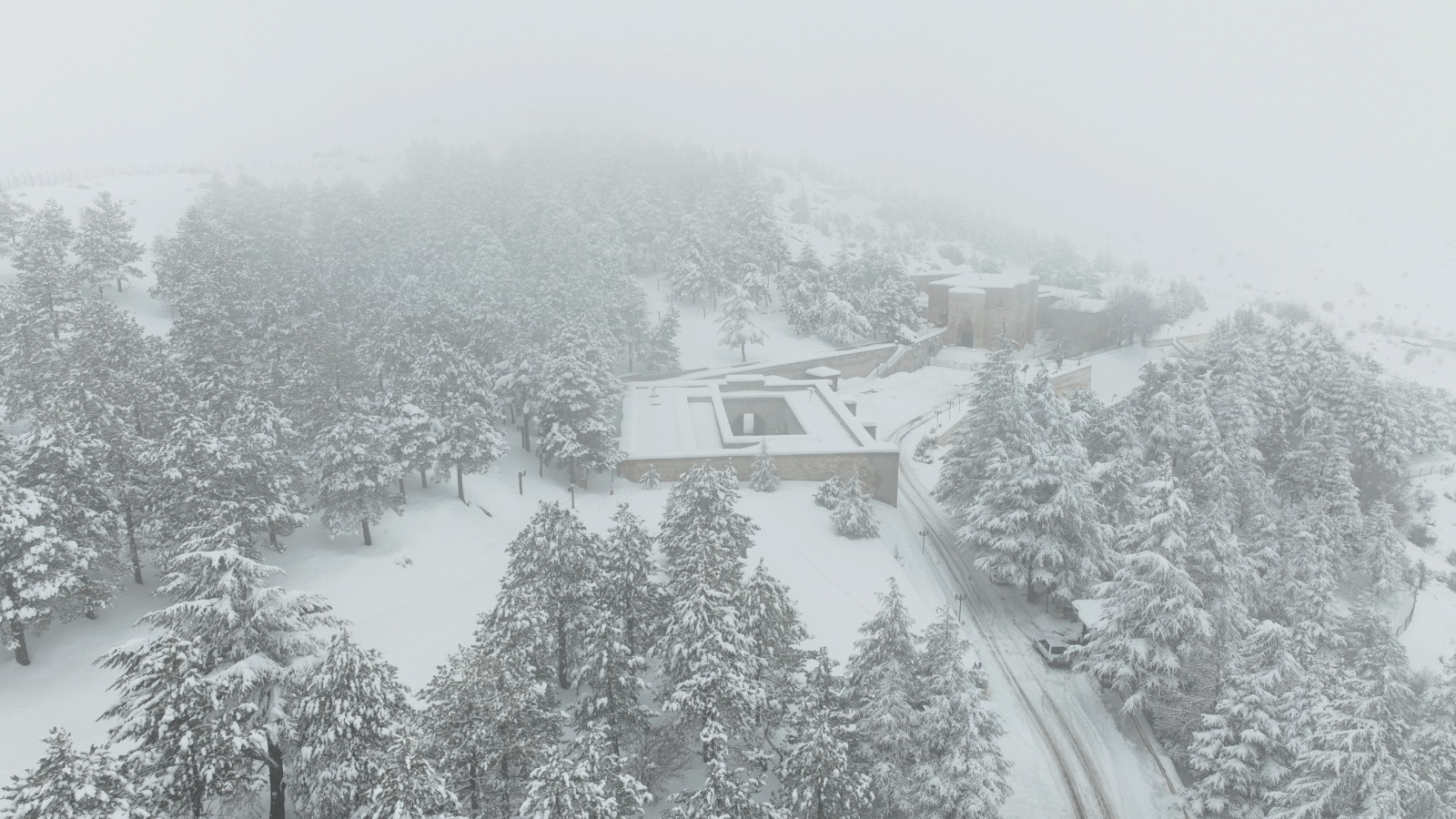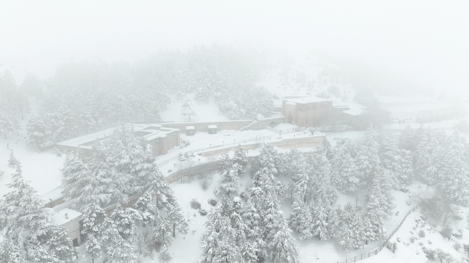 Afşin’de bulunan Ashab-ı Kehf Külliyesi yağan yoğun kar sonunda beyaza büründü. Ardından ise sise teslim oldu.