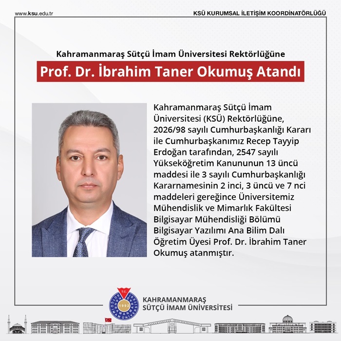 Kahramanmaraş Sütçü İmam Üniversitesi (KSÜ) Rektörlüğüne, 2026/98 sayılı Cumhurbaşkanlığı Kararı ile Cumhurbaşkanımız Recep Tayyip Erdoğan tarafından, 2547 sayılı Yükseköğretim Kanununun 13 üncü maddesi ile 3 sayılı Cumhurbaşkanlığı Kararnamesinin 2 inci, 3 üncü ve 7 nci maddeleri gereğince Üniversitemiz Mühendislik ve Mimarlık Fakültesi Bilgisayar Mühendisliği Bölümü Bilgisayar Yazılımı Anabilim Dalı Öğretim Üyesi Prof. Dr. İbrahim Taner Okumuş atandı.